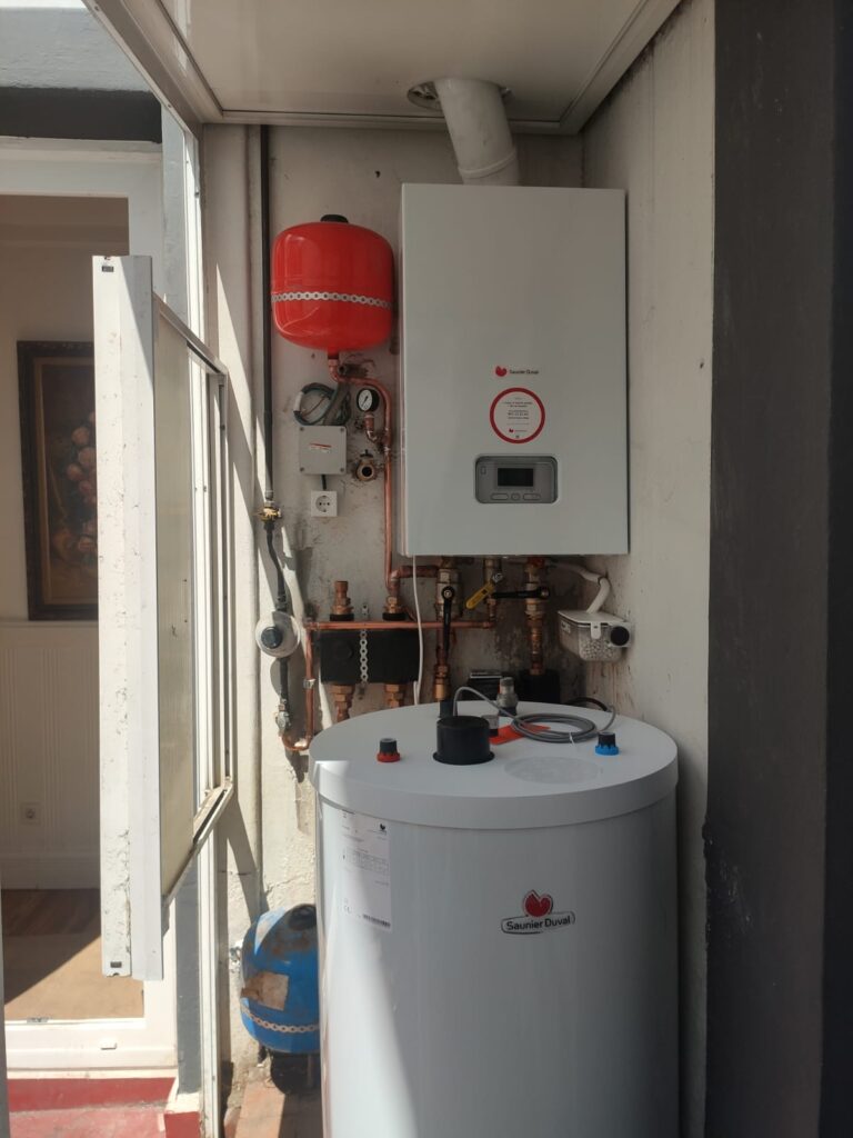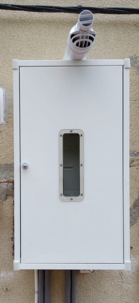 Caldera de condensación en cocina. Hermann Micraplus Condens 25 Reforma en vivienda, caldera de condensación. Caldera de condensación con salida de doble flujo. Caldera en exterior dentro de armario prefabricado. Vaillant ecotec PURE, modelo de VAILLANT. Caldera de alta potencia con acumulador de agua caliente sanitaria.