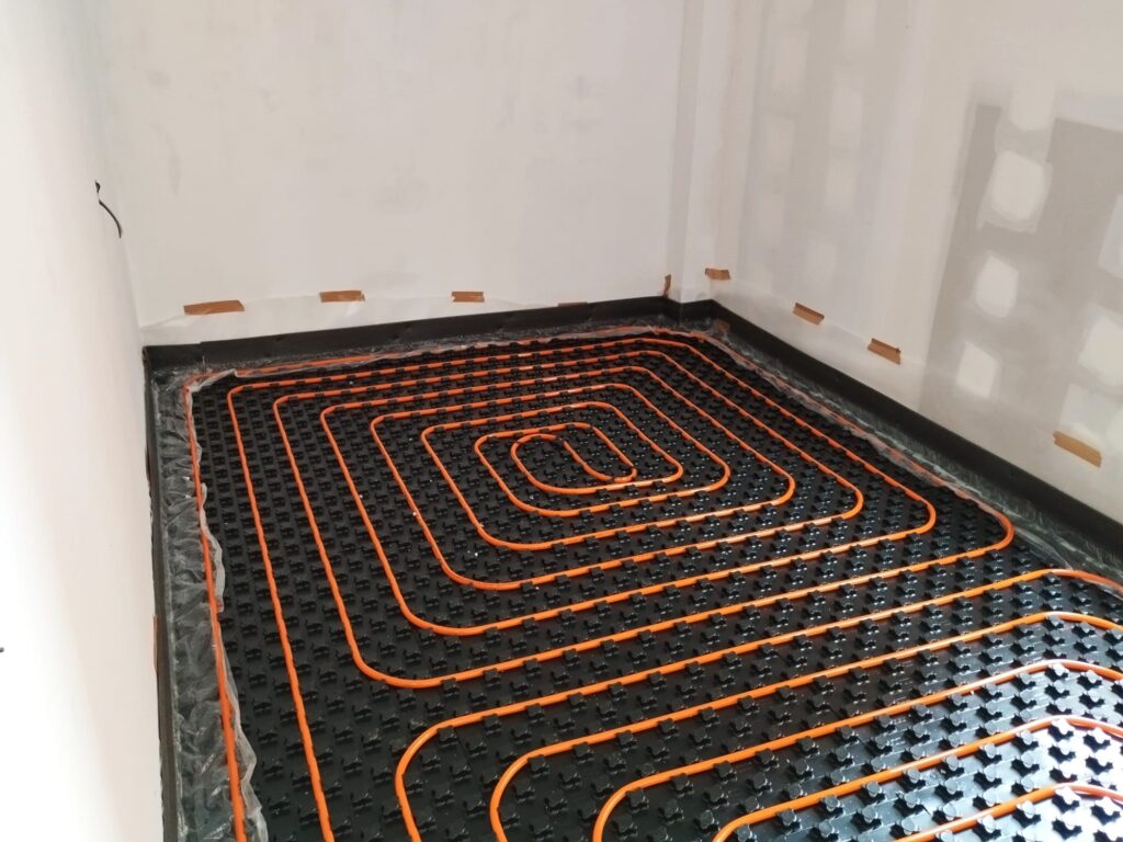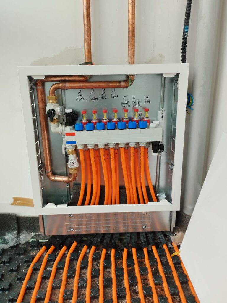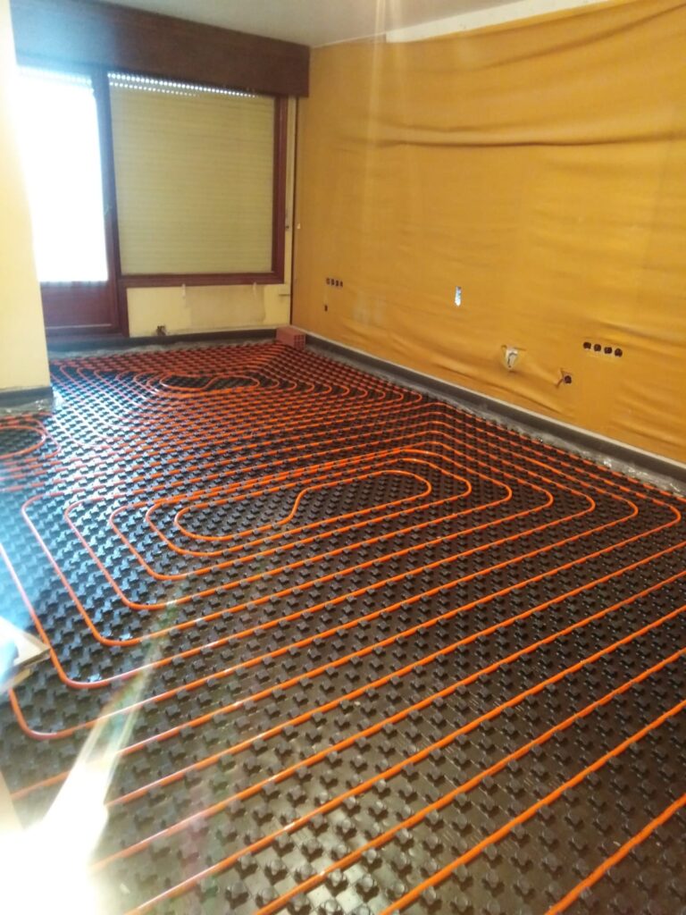 Fase primera, colocación de capa de aislamiento con filtro antihumedad debajo. Instalación de circuito según estudio previo. Lamina de aislamiento antihumedad. Colector principal con caudalímetros, manómetro, etc. Distribución de tuberías en sala. Instalación de mortero autonivelante especialmente diseñado para suelo radiante. Obra de nuestro colaborador morteros Acota.https://www.morterosacota.com/